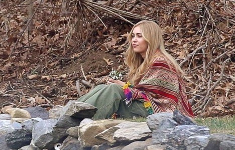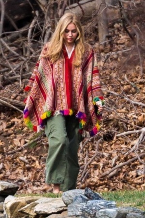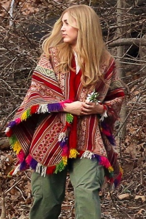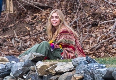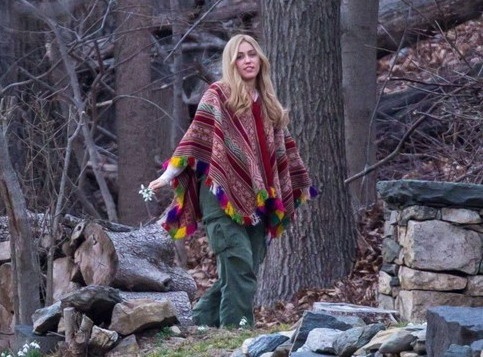 На новых фото Майли запечатлена в цветастом пончо с длинными волосами и романтическим букетиком цветов – прямо как в старые добрые времена Ханны Монтаны, вот только выглядит звезда слегка опухшей не в пример своему юному альтер-эго.