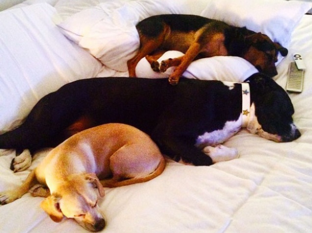 У себя в фотоблоге знаменитость часто показывает свой зверинец. Сегодня Майли разместила забавное фото трех спящих на кровати собак, подписав его следующими словами: "Самые милые сонные щенки-ангелочки. Я зачастую сплю на краю".