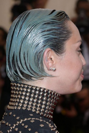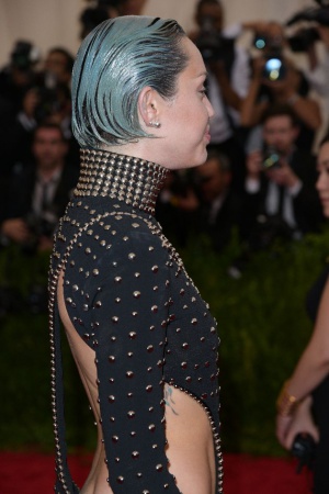 На ежегодный Бал института костюма Майли Сайрус пришла в довольно сдержанном черном наряде, однако, девушка выкрасила свои белокурые волосы в синий цвет. Более того, судя по фотоснимкам, Майли нанесла на волосы гель или жидкость, которая создавала эффект немытых волос.