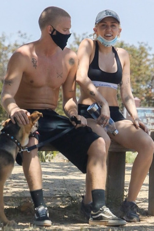 Для выхода в люди Сайрус выбрала черные мини-шорты и короткий топ бренда Calvin Klein. Образ звезда дополнила серой кепкой, кроссовками и защитной маской. Бойфренд певицы вышел в длинных шортах, носках, кедах и маске на лице.
