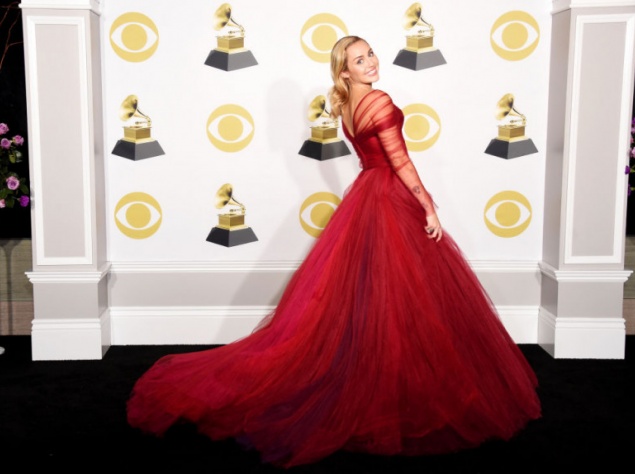 Майли Сайрус появилась на красной дорожке "Грэмми-2018" в пышном длинном платье со шлейфом.