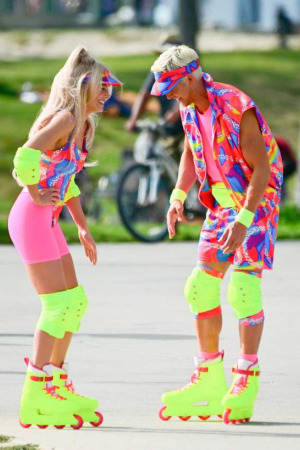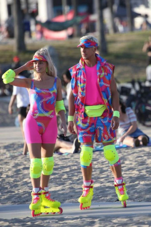 На фото, которые свели Интернет с ума, Робби и Гослинг весело катаются на пляже на роликах в ярких образах, которые полностью вдохновлены 80-ми.
