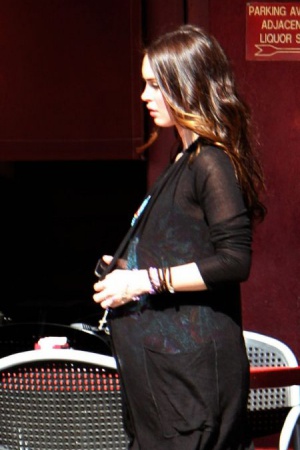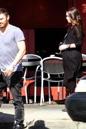 Меган Фокс была замечена в обществе мужа в Лос-Фелисе (Калифорния). Актриса прикрывает кофтой свой животик.