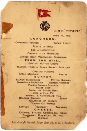 В меню, датированном 14 апреля 1912 года, предлагаются такие блюда, как баранья отбивная на гриле, креветки, солонина, пудинг и несколько видов сыров. Сообщается, что на сушу меню попало вместе с пассажиром первого класса Авраамом Линкольном Саломоном, которому удалось спастись с терпящего крушение судна. Кстати, на обратной стороне листка говорится, что ранее настоящим владельцем меню был некий Исаак Джеральд Фрауэнталь. Стоимость лота сейчас оценивается в 50-60 тысяч долларов, но не исключено, что во время "борьбы" за него на аукционе стоимость поднимется в разы. А вы бы приобрели себе какую-нибудь вещицу с затонувшего "Титаника"?