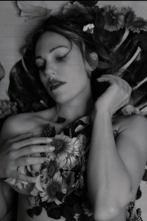 На фотографиях Мерьем топлес и с ярким макияжем позирует лежа на полу усыпана цветами, прикрывая обнаженную грудь руками.