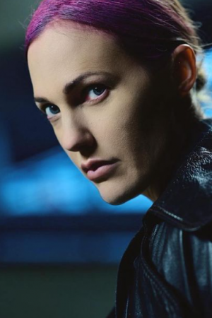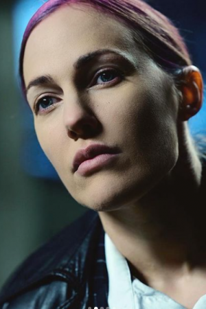 На фотографиях Мерьем Узерли предстает с фиолетовыми волосами, завязанными в тугой хвост, а также в черном кожаном плаще. Строгости луку Мерьем добавил черный костюм и белая рубашка.