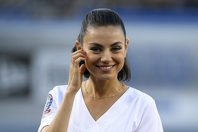 Вчера днем 34-летняя Мила Кунис поддержала традицию и бросила первый мяч на матче бейсбольной команды Dodgers на стадионе в Лос-Анджелесе.