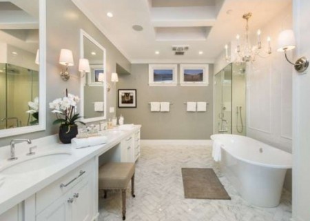В доме имеются пять спальных комнат, кинотеатр, тренажерный зал, а во дворе огромный бассейн и терраса с баром для гостей.