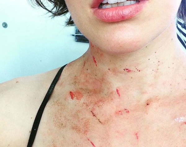 Милла Йовович дала фанатам повод для волнения. Она опубликовала на своей странице в "Инстаграме" фото с расцарапанной, окровавленной шеей. Столь жуткий снимок обескуражил многих подписчиков актрисы, особенно тех, кто не знает английского языка. Несмотря на то, что Милла прекрасно говорит по-русски, свои аккаунты в социальных сетях она ведет только на английском языке. Оказывается, раны на теле актрисы поддельные, это специальный художественный грим. Подпись к фото Йовович можно перевести так: "Кровь и царапины. Тест грима "ранений" Элис".