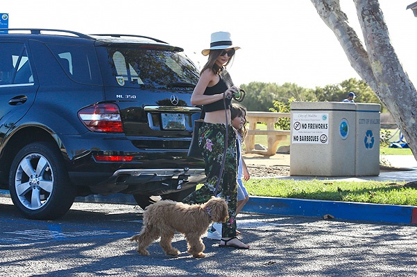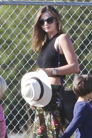 Для прогулки в этот солнечный день Миранда Керр выбрала свободные брюки с цветочным принтом и черный топ, обнажающий плоский живот модели. Дополнила свой образ манекенщица сандалиями, светлой шляпой, и солнцезащитными очками.