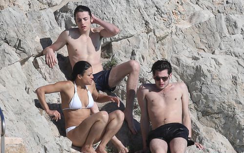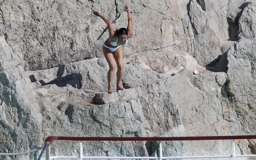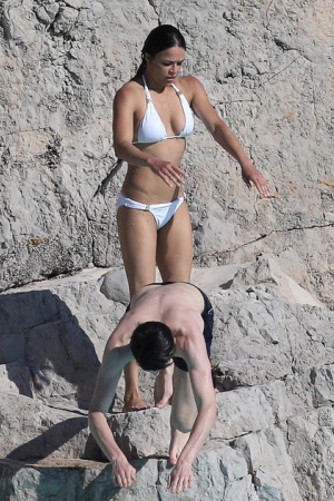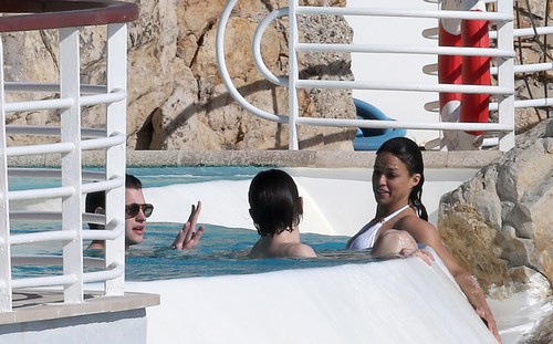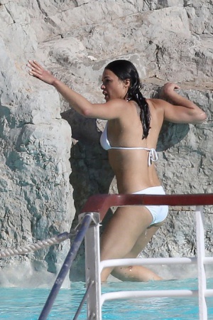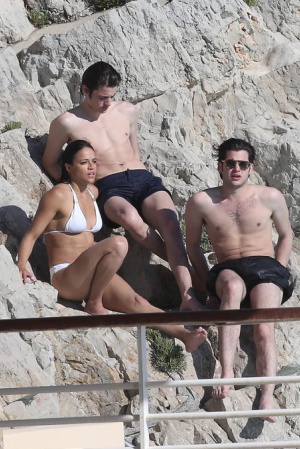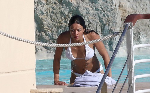 Мишель отлично проводила время в компании Гарри и Питера Брантов — известных тусовщиков и сыновей знаменитой модели Стефани Сеймур. Компания веселилась у открытого бассейна в скалах. Они загорали на солнце и прыгали в воду прямо с каменистого берега.Родригес красовалась в белом бикини, которое подчеркивало ее спортивную фигуру и отличный загар.