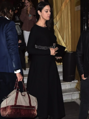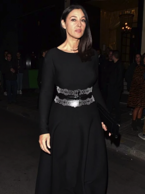 Для выхода итальянка надела длинное элегантное платье черного цвета и украсила его широким ремнем с инкрустированными стразами. Такой образ Моника дополнила лаковым клатчем в тон.