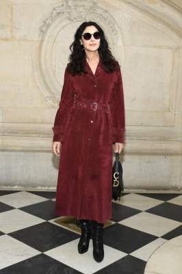 На модном показе Моника появилась в бордовом замшевом платье с поясом.