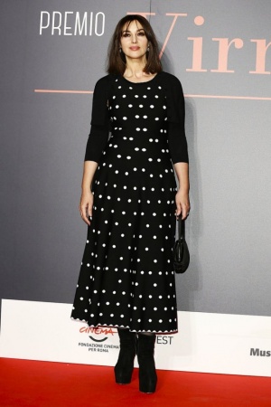 Моника поразила публику сияющей внешностью и новым образом, который сделал ее на несколько лет моложе. Беллуччи распрощалась со своими длинными волосами, изменила челку и сделала себе классический прямой боб. Не меньшего внимания стоил ее наряд. Для публичного выхода соблазнительная итальянка выбрала платье с узором в горох. А игривый покрой только подчеркнул отличное настроение красивой Моники.