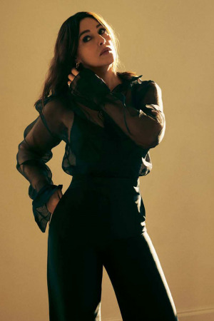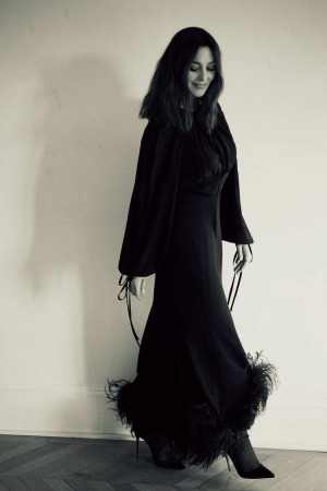 В новой фотоистории 57-летняя кинозвезда появилась в элегантных образах. Беллуччи позировала в бежевом трикотажном платье длины миди с декольте, в черном облегающем платье, эффектной блузе в дуэте с черными широкими брюками, а также в пальто и жакете.