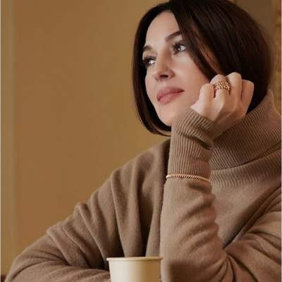 На другом фото Беллуччи предстает в мечтательном образе, надев теплый светло-коричневый свитер.