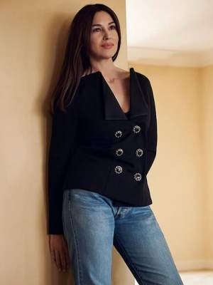 На одном из снимков Моника позирует в черном пиджаке с крупными пуговицами и джинсах.