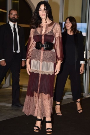 Для открытия выставки "Glamour 'n Soul" фотографа Франческо Эскалара в музее Maxxi в Риме, Беллуччи выбрала черную комбинацию, поверх которой надела полупрозрачную тунику с кружевом.