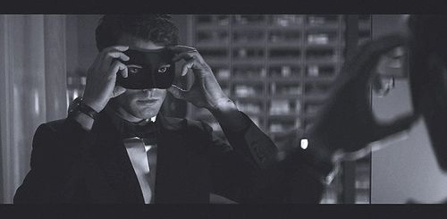 Первые официальные фото со съемочной площадки "На пятьдесят оттенков темнее". На фотографии Джейми Дорнан в роли Кристиана Грея примеряет карнавальную маску перед зеркалом.