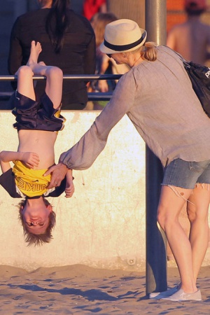 Наоми, ее муж Лив Шрайбер и двое их сыновей посвятили время спорту. Пока мальчики осваивали турники на пляже, заботливые родители внимательно следили за их безопасностью.