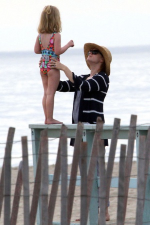 Эми, ее возлюбленный Даррен Ле Галло и их четырехлетняя дочь выбрали более спокойный вид отдыха. Они установили на берегу удобный шатер и отправились к воде помочить ноги в холодном океане. Впрочем, не обошлось и без игр на свежем воздухе.