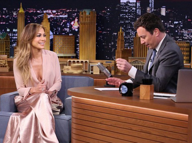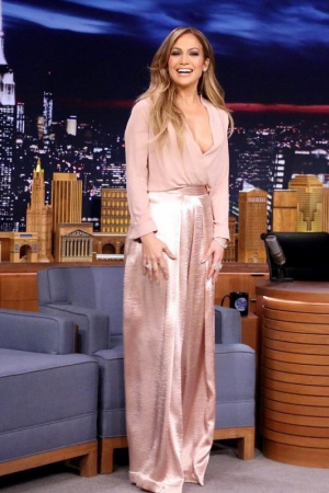 На ТВ-шоу Джимми Фэллона 45-летняя звезда прибыла в наряде пудрового оттенка и, конечно же, с глубоким декольте.