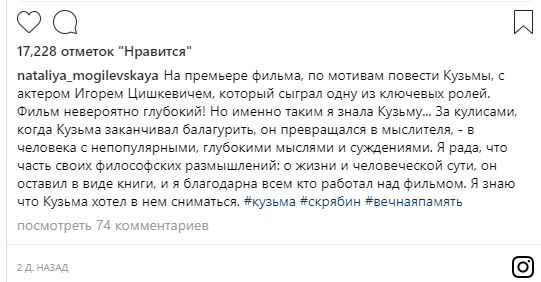 Так, на днях певица побывала на закрытой премьере фильма, снятого по мотивам повести Скрябина. В Инстаграм Могилевская рассказала, каким прекрасным человеком был Кузьма, а также поделилась подробностями о фильме.