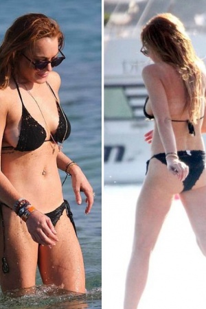 Для подобной прогулки Линдси Лохан выбрала раздельный купальник, из которого её грудь то и дело грозила вывалиться, что добавляло этому развлечению эротизма.