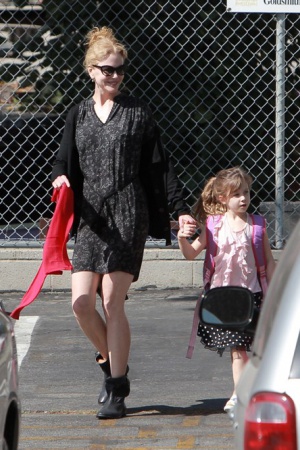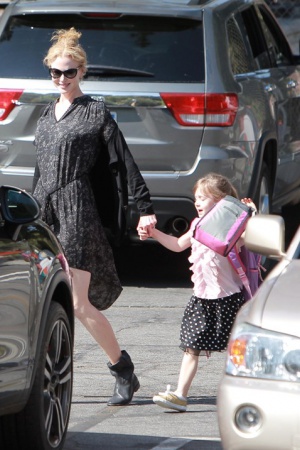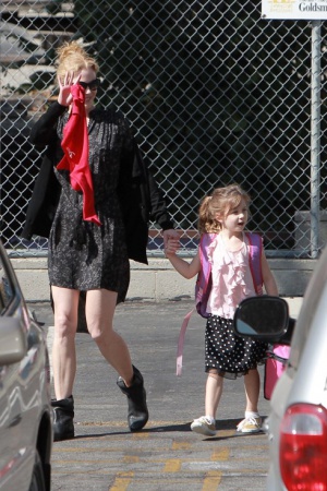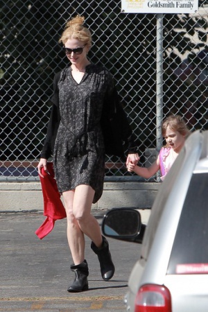 Чтоб барышне не было скучно или тоскливо, в школу ее ведет звездная мама. Очень здорово, кстати, одетая – в стильный городской кэжуал с едва заметным налетом кантри. Папа у них все таки – канти-певец, нужно соответствовать. В общем, хоть многие и поспорят с этим мнением, в таком небрежном и милом наряде Кидман выглядит моложе, чем в "полном боевом облачении" на красной дорожке.