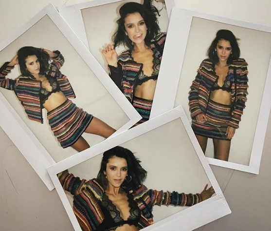 Фотоколлаж выполненный в стиле собранных и развешанных на стенке фотографий, где актриса позирует в стильном летнем аутфите.