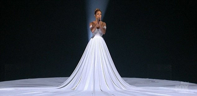 Дженнифер пела неподвижно в экспансивном белом платье, длиной около 6 метров, подол которого равномерно расположился вокруг нее на полу.