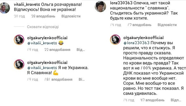 Однако, когда подписчики стали критиковать ее за советскую символику и писать, что она не украинка, в комментариях она ответила, что славянка, а анализ ДНК показал, что в ней нет украинской крови.