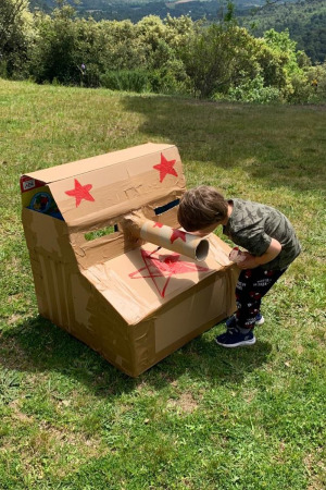 В честь 9 мая актриса поделилась фотографией 4-летнего сына Александра Макса Горацио, который раскрашивает картонную коробку в форме танка красными звездами.