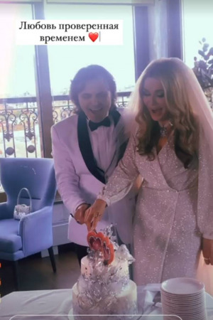 Виталий Борисюк для праздничного дня выбрал белый смокинг с бабочкой, а Ольга Сумская надела потрясающее серебряное платье и фату. Их дочь Анна Борисюк поделилась в Instastories милым снимком, подписав его "Любовь, проверенная временем".