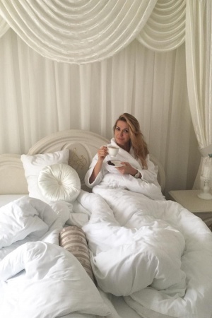 Сейчас звезда находится на гастролях в Кривом Роге. На снимке Ольга позирует лежа в кровати в белом банном халате.