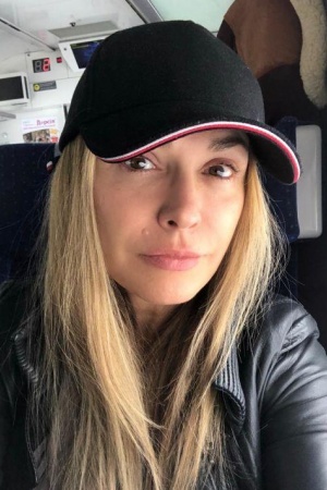Актриса сфотографировалась в поезде в бейсболке, кожаной куртке и без косметики на лице.
