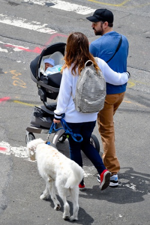 Уик-энд актеры решили провести тихо и по-семейному. Они прогуливались по улицам Большого яблока с коляской, трогательно держась за руки. Компанию дополнял любимец пары - белоснежный пес.