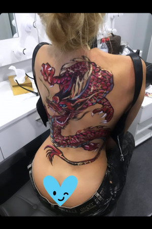Полякова же показала несколько фото татуировки. На спине певицы видим огромное изображение красного дракона, из пасти которого выходит пламя. При этом Полякова также показала одно фото, на котором дракон еще в процессе создания.