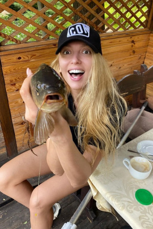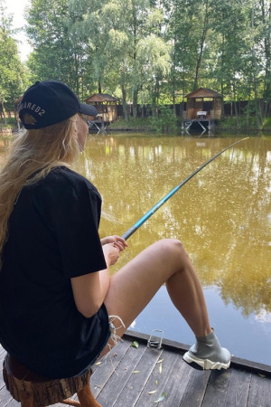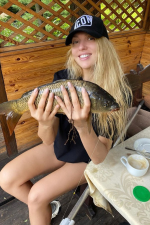 На одном фото артистка показала, как сидит на берегу озера с удочкой. На двух других снимках Полякова позировала в деревянной беседке с карпом в руках.