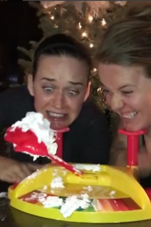 В этот раз генератором веселья стала игра, по правилам которой один из проигравших получает порцию взбитых сливок в лицо. Мини-роликами Кэти Пери и Орландо Блум поделились в своих аккаунтах в Instagram. На одном из роликов Кэти бросила вызов своей старшей сестре Анджеле, но так и не сумела опередить ее в количестве нажатий кнопки и взбитые сливки оказались на лице певицы. Орландо Блуму не удалось показать правильный пример Кэти, и в соревновании против ее младшего брата Дэвида он также потерпел поражение. Между тем, несмотря на совместное поражение, парочка своему проигрышу не огорчилась.