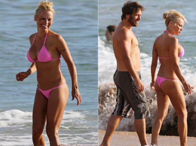 Секс символ 90-х, Памела Андерсон смело демонстрирует свою ненастоящую грудь и подтянутое тело.