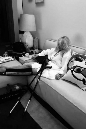 В Instagram звезда выложила фото, где предстает с бандажом на ноге, а рядом стоят костыли.