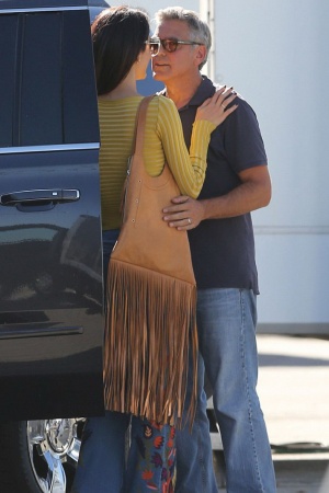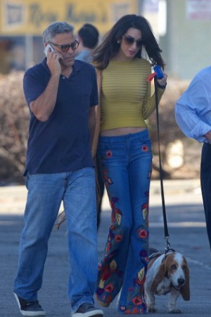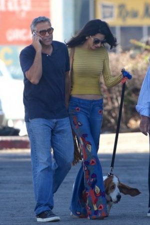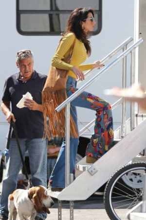 Амаль с собакой приехала проведать мужа, а Джордж встретил ее у машины. Супруги все время держались за руки, пока прогуливались по съемочной площадке.