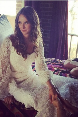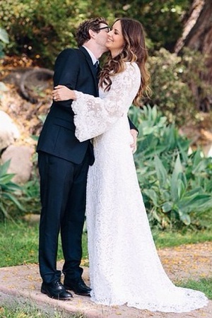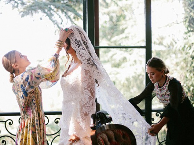 Не секрет, что стиль самих сестричек Олсен далек от общепризнаных стандартов, но платье получилось очень классическим и нежным. Главный нюанс состоял в сложном кружеве, из которого был сшит весь наряд и благодаря которому невеста казалась воздушной. Платье сдержанное, с рукавами-фонариками, но открытыми плечами. Завершила образ невесты кружевная вуаль.