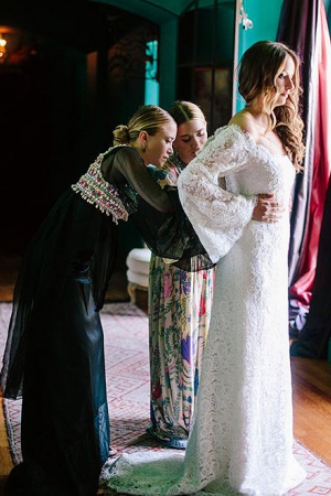 С Молли Фишер Мэри-Кейт и Эшли Олсен дружат больше 15 лет, поэтому когда подруга в июне объявила, что обручилась с режиссером-постановщиком Ашером Левином, сестры тут же вызвались сшить ей свадебное платье. Рисковали все трое, ведь сестры, владелицы марки The Fow, хоть и покоряют подиумы с 2006 года, наряд невесты шили впервые.