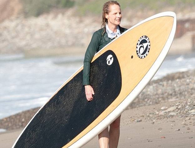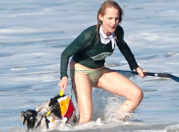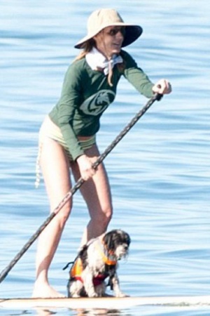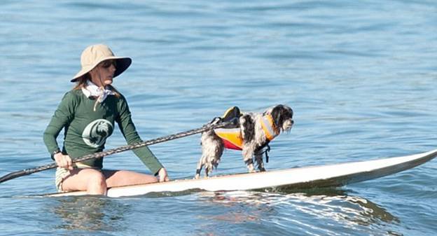 Хелен Хант большая поклонница катания на доске с веслом и, похоже, что она приучила к этому и свою любимую собаку.