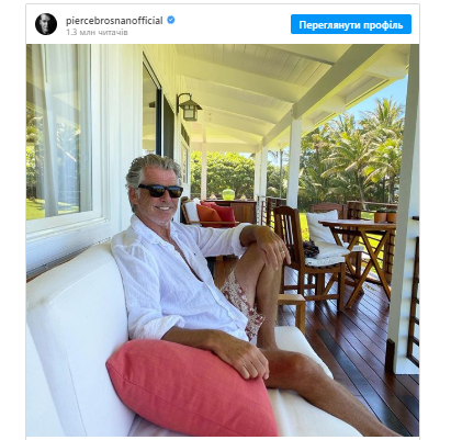 Снимок, который Пирс распространил в сети, сделала его жена Кили Шей Смит. Актер изображен с фирменной улыбкой на лице. Он позирует, сидя на террасе в белой рубашке и цветных шортах.