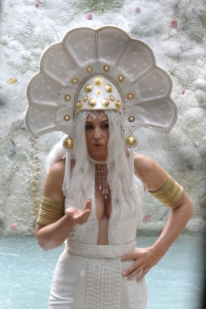 Моника в фильме исполняет роль Белой королевы. Красотку облачили в белый наряд, соорудили огромную "корону" и надели белый парик.