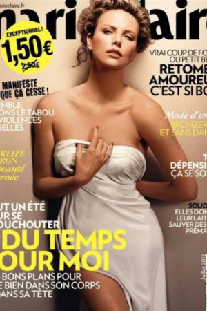 Шарлиз Терон украсила июльскую обложку Marie Claire. На страницах журнала появились фотографии актрисы в полуобнаженном виде. На них Шарлиз лишь прикрывается тонкой простыней.