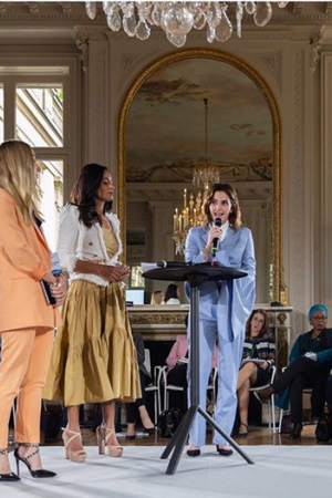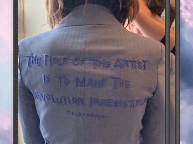 Для официального мероприятия Эмма выбрала довольно сдержанный, однако не менее стильный наряд. Перед участниками Уостон появилась в светло-голубом костюме от Teatum Jones. Примечательно, что сзади на жакете была вышита цитата афроамериканской писательницы Тони Кейд Бамбары:
